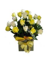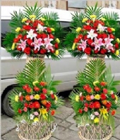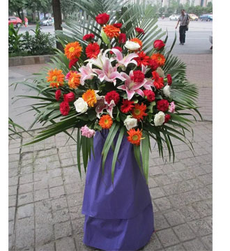 白+粉百合6朵,30支紅色扶郎花,10支粉色扶郎花,16支黃色扶郎花,黃鶯,散尾葵等豐滿搭配。