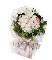 5朵白百合,35朵鮮花(太陽花,白玫瑰,康乃馨),散尾葵豐滿搭配。